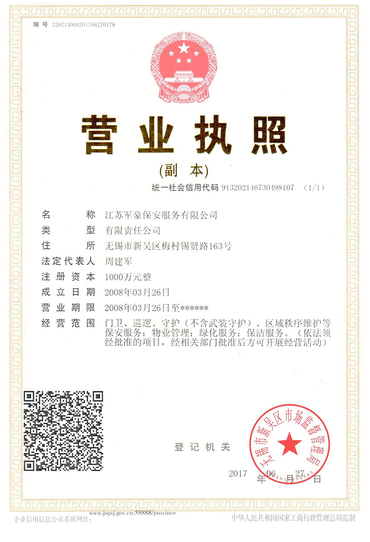 江蘇軍豪保安服務(wù)有限公司專業(yè)提供保安保潔服務(wù) 總經(jīng)理:周建軍 13771566978? 電話:0510-88157939 81891688? 傳真:0510-88157939-8008
